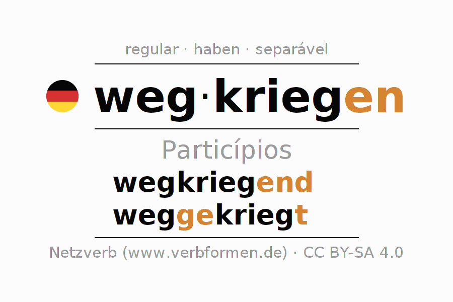 A conjugação do verbo wegkriegen no Ativo Particípio Presente Perfeito palavra discurso é: wegkriegend, weggekriegt.A formação dessas formas segue determinadas regras gramaticais. Os requisitos para a conjugação do verbo como forma verbal simples no wegkriegen do Particípio. Comentários ☆