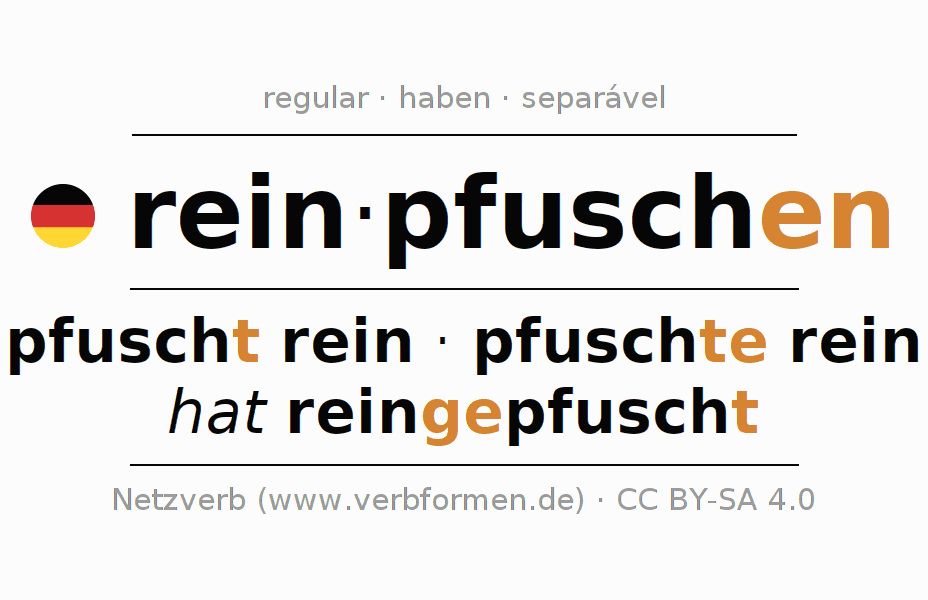 O verbo reinpfuschen é totalmente conjugado em todas as pessoas e números no Particípio Presente Perfeito