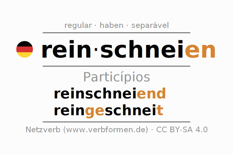 O verbo reinschneien é totalmente conjugado em todas as pessoas e números no Particípio Presente Perfeito