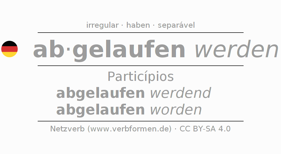 A conjugação do verbo ablaufen no Voz Passiva Particípio Presente Perfeito palavra discurso é: abgelaufen werdend, abgelaufen worden.A formação dessas formas segue determinadas regras gramaticais. Os requisitos para a conjugação do verbo como forma verbal simples no ablaufen do Particípio. Comentários ☆