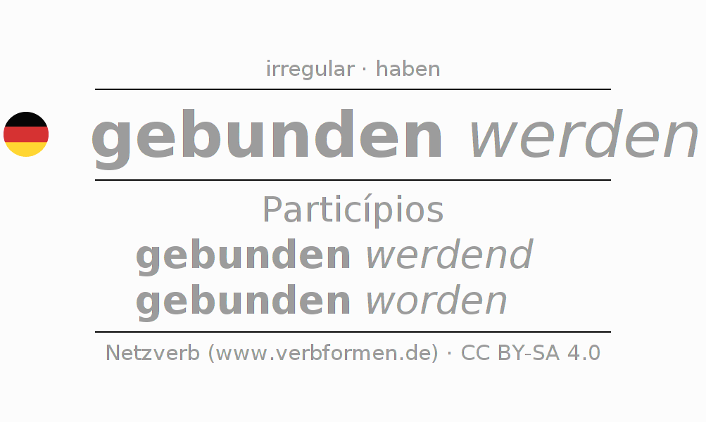 A conjugação do verbo binden no Voz Passiva Particípio Presente Perfeito palavra discurso é: gebunden werdend, gebunden worden.A formação dessas formas segue determinadas regras gramaticais. Os requisitos para a conjugação do verbo como forma verbal simples no binden do Particípio. Comentários ☆