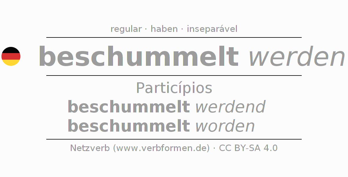 A conjugação do verbo beschummeln no Voz Passiva Particípio Presente Perfeito palavra discurso é: beschummelt werdend, beschummelt worden.A formação dessas formas segue determinadas regras gramaticais. Os requisitos para a conjugação do verbo como forma verbal simples no beschummeln do Particípio. Comentários ☆