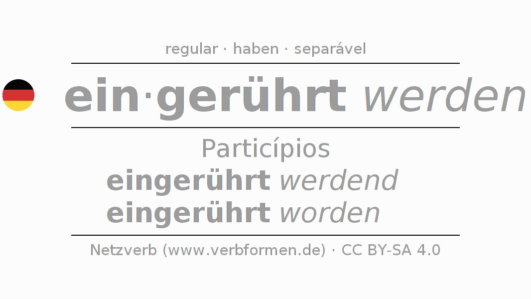 A conjugação do verbo einrühren no Voz Passiva Particípio Presente Perfeito palavra discurso é: eingerührt werdend, eingerührt worden.A formação dessas formas segue determinadas regras gramaticais. Os requisitos para a conjugação do verbo como forma verbal simples no einrühren do Particípio. Comentários ☆