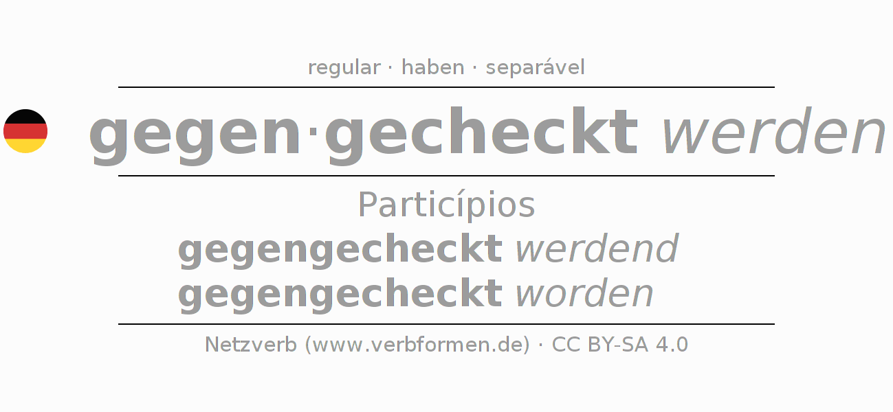 A conjugação do verbo gegenchecken no Voz Passiva Particípio Presente Perfeito palavra discurso é: gegengecheckt werdend, gegengecheckt worden.A formação dessas formas segue determinadas regras gramaticais. Os requisitos para a conjugação do verbo como forma verbal simples no gegenchecken do Particípio. Comentários ☆