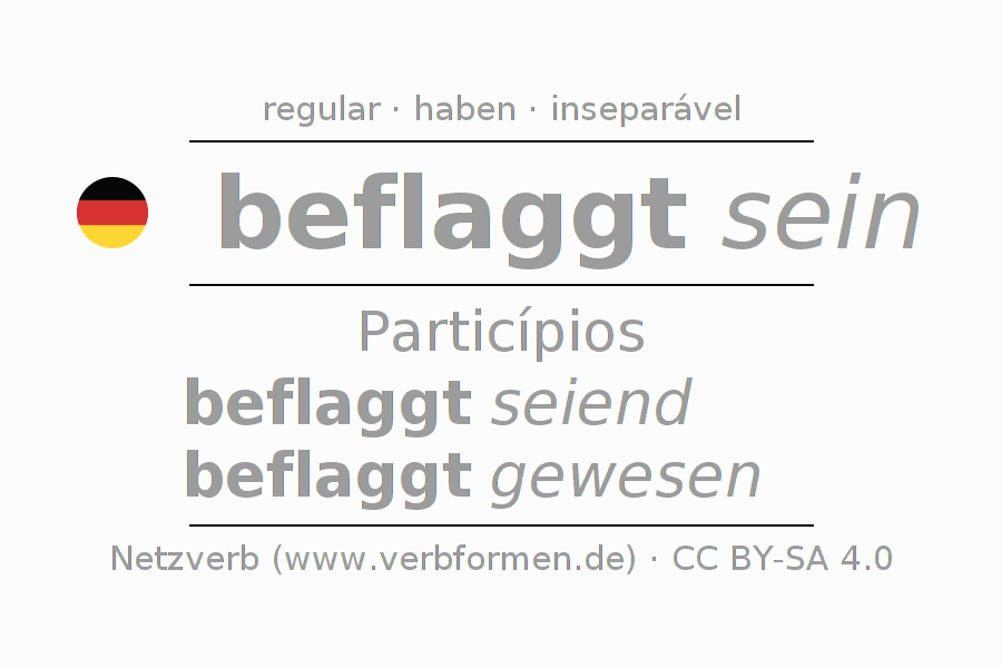 A conjugação do verbo beflaggen no Estado passivo Particípio Presente Perfeito palavra discurso é: beflaggt seiend, beflaggt gewesen.A formação dessas formas segue determinadas regras gramaticais. Os requisitos para a conjugação do verbo como forma verbal simples no beflaggen do Particípio. Comentários ☆