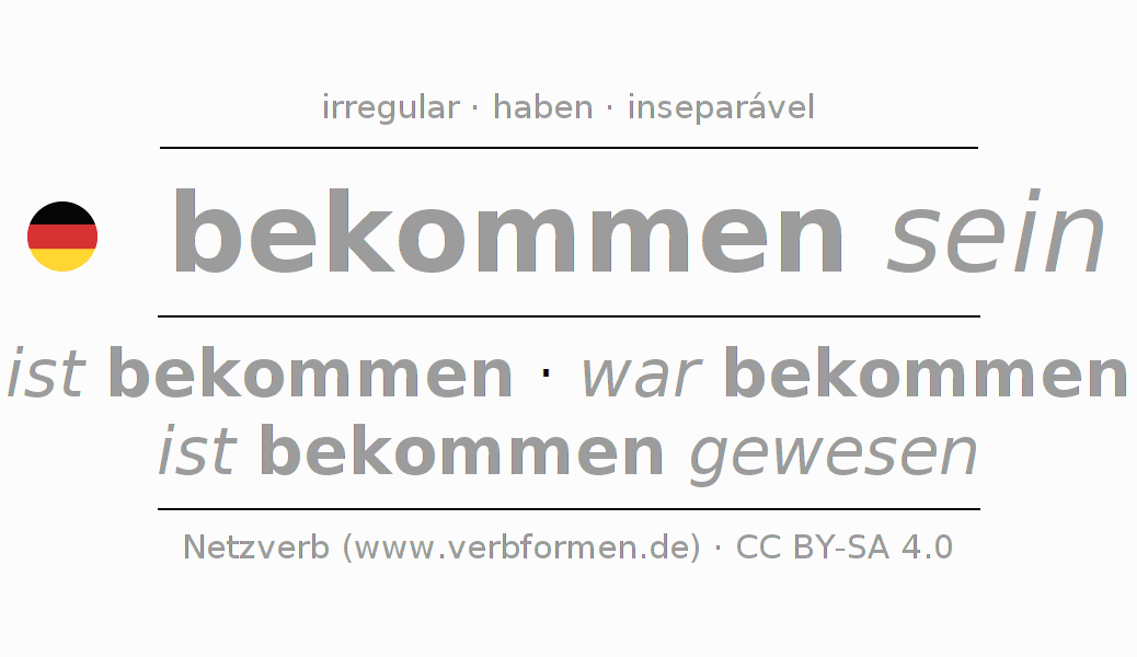 A conjugação do verbo bekommen no Estado passivo Particípio Presente Perfeito palavra discurso é: bekommen seiend, bekommen gewesen.A formação dessas formas segue determinadas regras gramaticais. Os requisitos para a conjugação do verbo como forma verbal simples no bekommen do Particípio. Comentários ☆