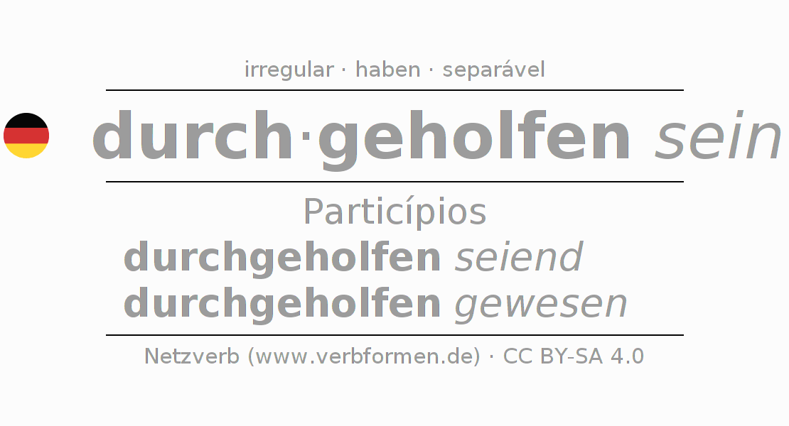 A conjugação do verbo durchhelfen no Estado passivo Particípio Presente Perfeito palavra discurso é: durchgeholfen seiend, durchgeholfen gewesen.A formação dessas formas segue determinadas regras gramaticais. Os requisitos para a conjugação do verbo como forma verbal simples no durchhelfen do Particípio. Comentários ☆