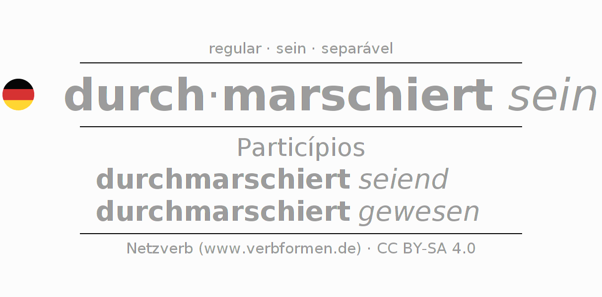 A conjugação do verbo durchmarschieren no Estado passivo Particípio Presente Perfeito palavra discurso é: durchmarschiert seiend, durchmarschiert gewesen.A formação dessas formas segue determinadas regras gramaticais. Os requisitos para a conjugação do verbo como forma verbal simples no durchmarschieren do Particípio. Comentários ☆