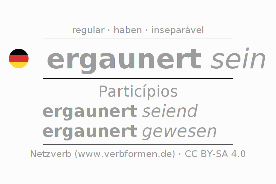 A conjugação do verbo ergaunern no Estado passivo Particípio Presente Perfeito palavra discurso é: ergaunert seiend, ergaunert gewesen.A formação dessas formas segue determinadas regras gramaticais. Os requisitos para a conjugação do verbo como forma verbal simples no ergaunern do Particípio. Comentários ☆