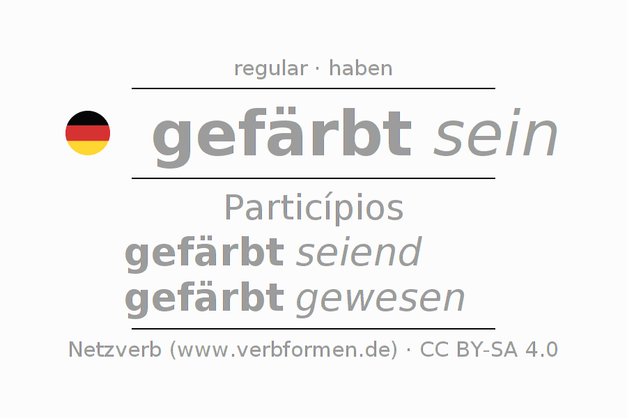 A conjugação do verbo färben no Estado passivo Particípio Presente Perfeito palavra discurso é: gefärbt seiend, gefärbt gewesen.A formação dessas formas segue determinadas regras gramaticais. Os requisitos para a conjugação do verbo como forma verbal simples no färben do Particípio. Comentários ☆