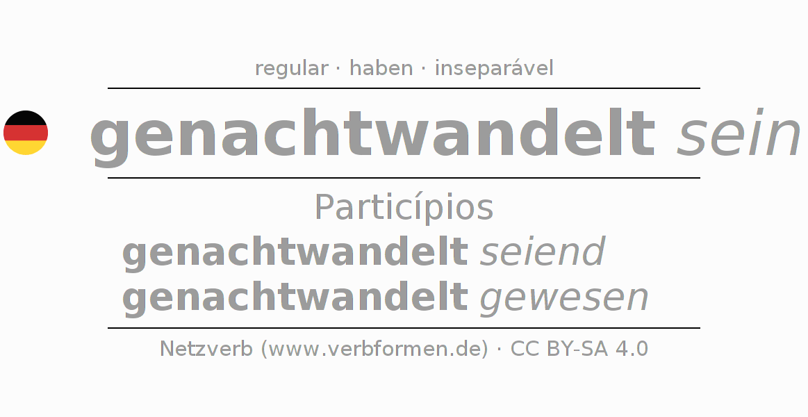 A conjugação do verbo nachtwandeln no Estado passivo Particípio Presente Perfeito palavra discurso é: genachtwandelt seiend, genachtwandelt gewesen.A formação dessas formas segue determinadas regras gramaticais. Os requisitos para a conjugação do verbo como forma verbal simples no nachtwandeln do Particípio. Comentários ☆