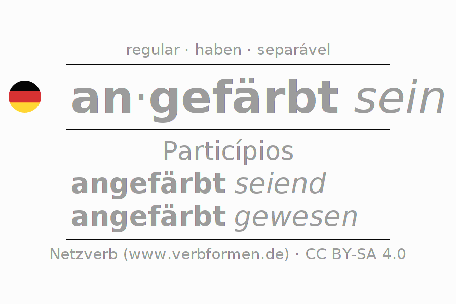 A conjugação do verbo anfärben no Estado passivo Particípio Presente Perfeito palavra discurso é: angefärbt seiend, angefärbt gewesen.A formação dessas formas segue determinadas regras gramaticais. Os requisitos para a conjugação do verbo como forma verbal simples no anfärben do Particípio. Comentários ☆