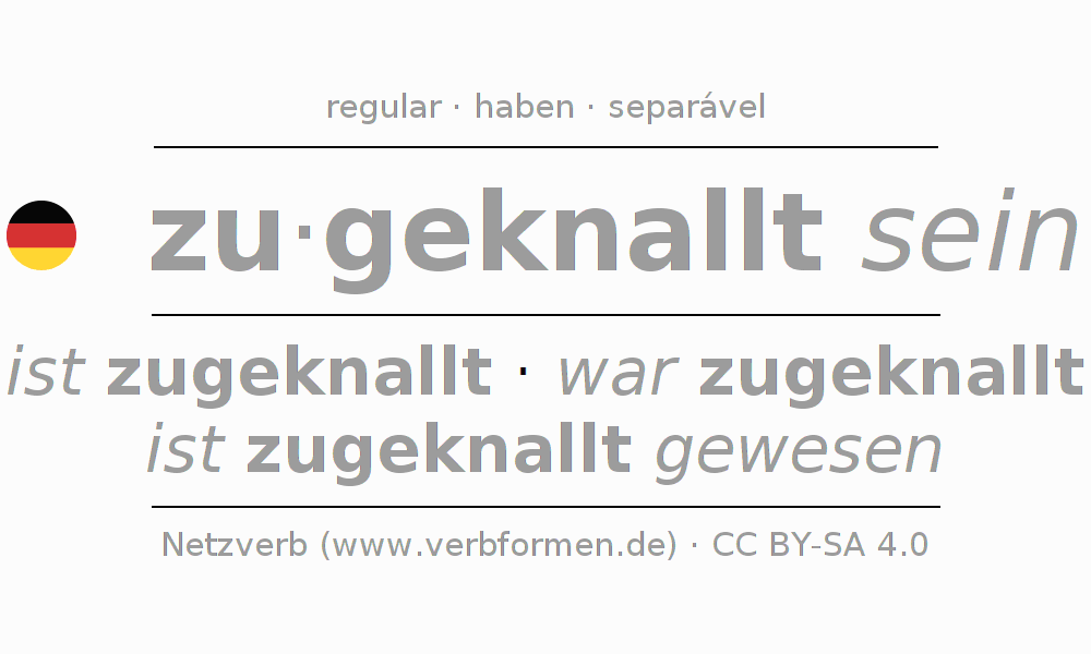 O verbo zuknallen (hat) é totalmente conjugado em todas as pessoas e números no Particípio Presente Perfeito