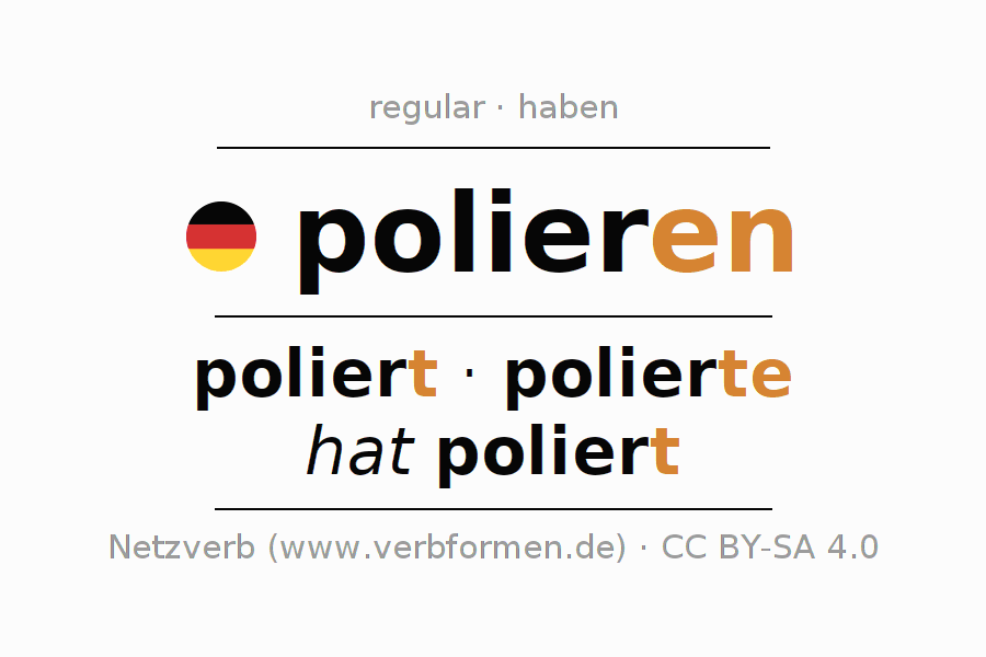 A conjugação do verbo polieren (polir, alisar) é regular. As formas mais comuns são poliert, polierte e hat poliert. O verbo auxilar para polieren é "haben".
