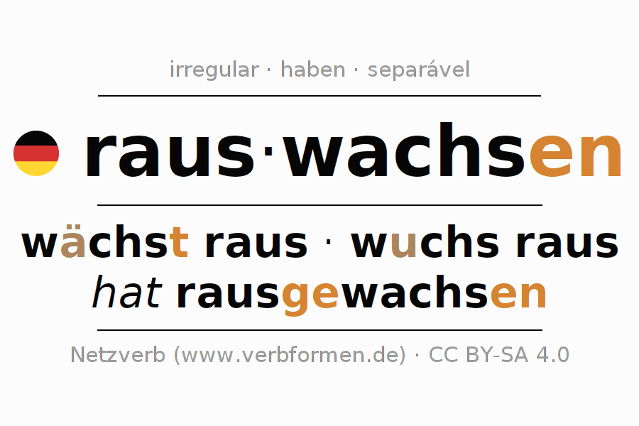 A conjugação do verbo rauswachsen (crescer, superar) é irregular. As formas mais comuns são wächst raus, wuchs raus e hat rausgewachsen. A apofonia é feita com a vogal do radical a