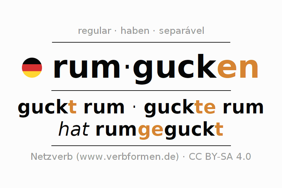 O prefixo rum - de rumgucken é separável. A flexão ocorre em Ativo e é usada como Oração principal. Para melhor compreensão estão disponíveis incontáveis. Exemplos do verbo rumgucken . Para a prática e consolidação do estudo