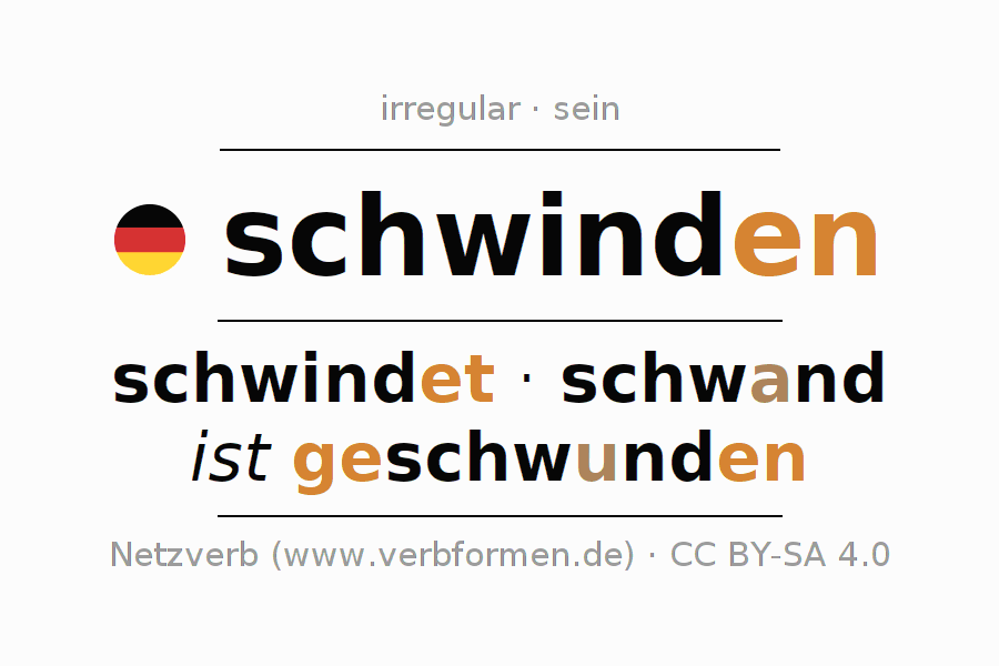 A conjugação do verbo schwinden (desaparecer, diminuir) é irregular. As formas mais comuns são schwindet, schwand e ist geschwunden. A apofonia é feita com a vogal do radical i