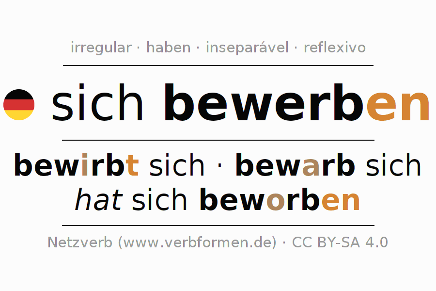 A conjugação do verbo bewerben (candidatar-se, concorrer) é irregular. As formas mais comuns são bewirbt sich, bewarb sich e hat sich beworben. A apofonia é feita com a vogal do radical e