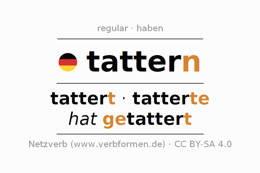 A conjugação do verbo tattern é apresentada online assim como a Tabela de Verbo com todas as formas verbais no singular e no plural, e em todas as pessoas (1ª pessoa, 2ª pessoa, 3ª pessoa) A flexão do verbo tattern é portanto, uma ajuda para os trabalhos de casa, testes, exames, aulas de alemão, para o estudo do alemão como língua estrangeira, como segunda língua e também na formação de adultos. Especialmente no aprendizado do alemão é importante a conjugação correta do verbo com as respectivamente formas flexionadas corretamente (tattert - tatterte - hat getattert). Mais informações podem ser encontradas no Wiktionary tattern e no Duden tattern.