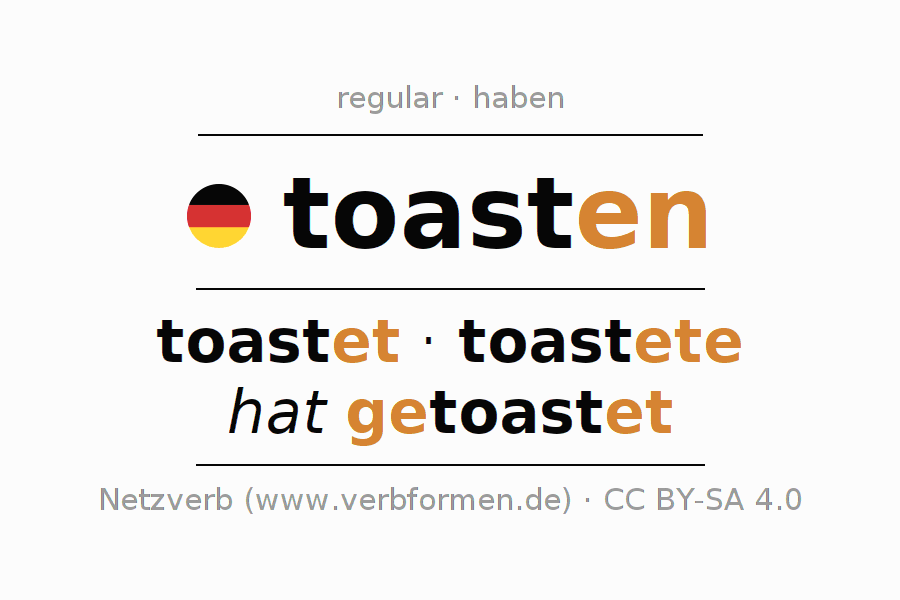- Presente: toast(e) (du), toasten wir, toastet (ihr), toasten Sie