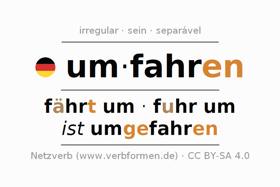 A conjugação do verbo umfahren é irregular. As formas mais comuns são fährt um, fuhr um e ist umgefahren. A apofonia é feita com a vogal do radical a