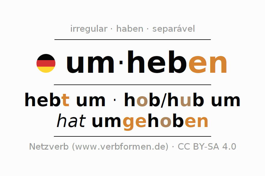 A conjugação do verbo um·heben é apresentada online assim como a Tabela de Verbo com todas as formas verbais no singular e no plural, e em todas as pessoas (1ª pessoa, 2ª pessoa, 3ª pessoa) A flexão do verbo um·heben é portanto, uma ajuda para os trabalhos de casa, testes, exames, aulas de alemão, para o estudo do alemão como língua estrangeira, como segunda língua e também na formação de adultos. Especialmente no aprendizado do alemão é importante a conjugação correta do verbo com as respectivamente formas flexionadas corretamente (hebt um - hob/hub um - hat umgehoben). Mais informações podem ser encontradas no Wiktionary umheben e no Duden umheben.