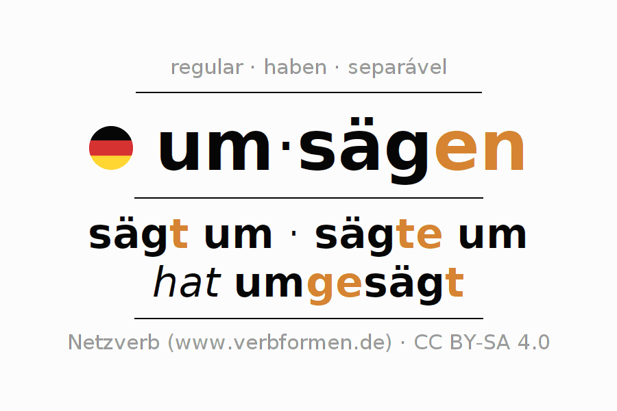 A conjugação do verbo um·sägen é apresentada online assim como a Tabela de Verbo com todas as formas verbais no singular e no plural, e em todas as pessoas (1ª pessoa, 2ª pessoa, 3ª pessoa) A flexão do verbo um·sägen é portanto, uma ajuda para os trabalhos de casa, testes, exames, aulas de alemão, para o estudo do alemão como língua estrangeira, como segunda língua e também na formação de adultos. Especialmente no aprendizado do alemão é importante a conjugação correta do verbo com as respectivamente formas flexionadas corretamente (sägt um - sägte um - hat umgesägt). Mais informações podem ser encontradas no Wiktionary umsägen e no Duden umsägen.
