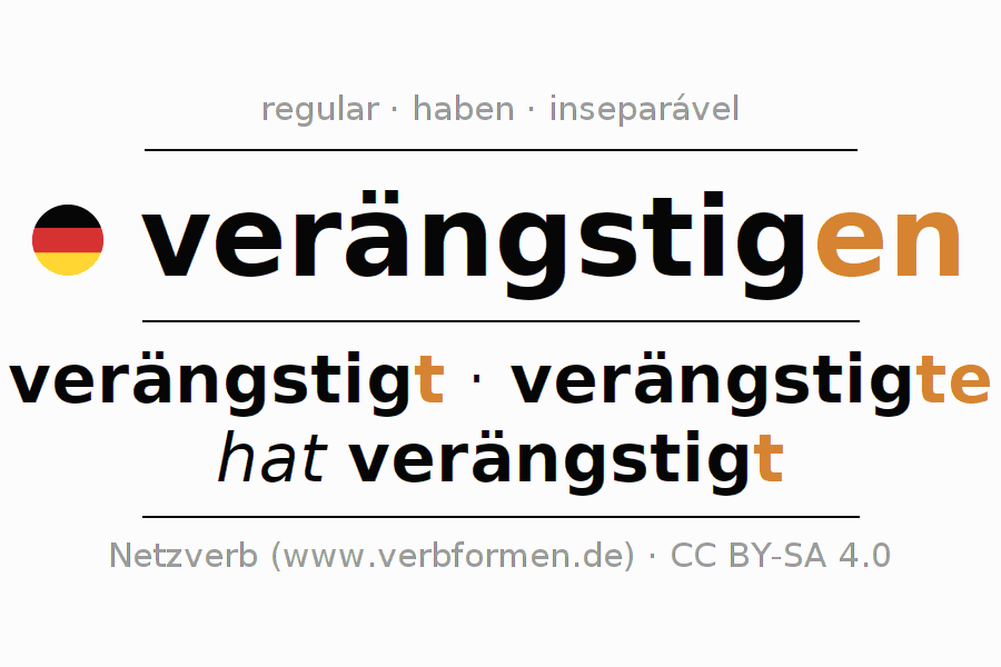 O prefixo ver- de verängstigen é inseparável. A flexão ocorre em Ativo e é usada como Oração principal. Para melhor compreensão estão disponíveis incontáveis. Exemplos do verbo verängstigen . Para a prática e consolidação do estudo