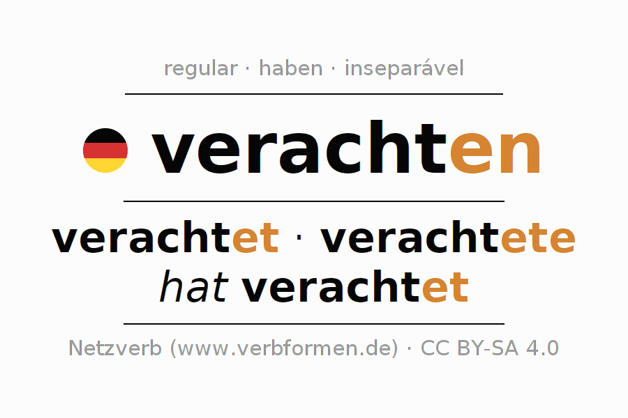 A conjugação do verbo verachten (desprezar, desconsiderar) é regular. As formas mais comuns são verachtet, verachtete e hat verachtet. O verbo auxilar para verachten é "haben".
