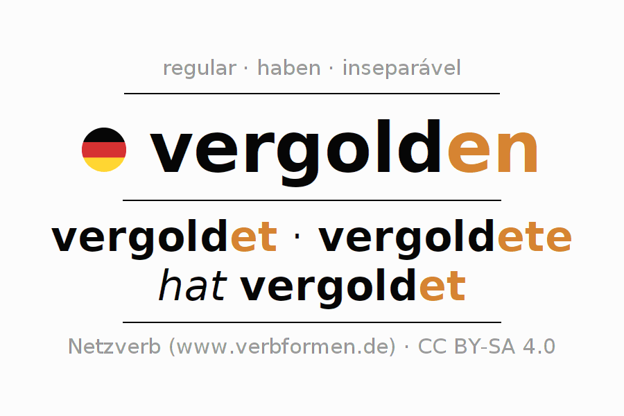 - Presente: vergold(e) (du), vergolden wir, vergoldet (ihr), vergolden Sie
