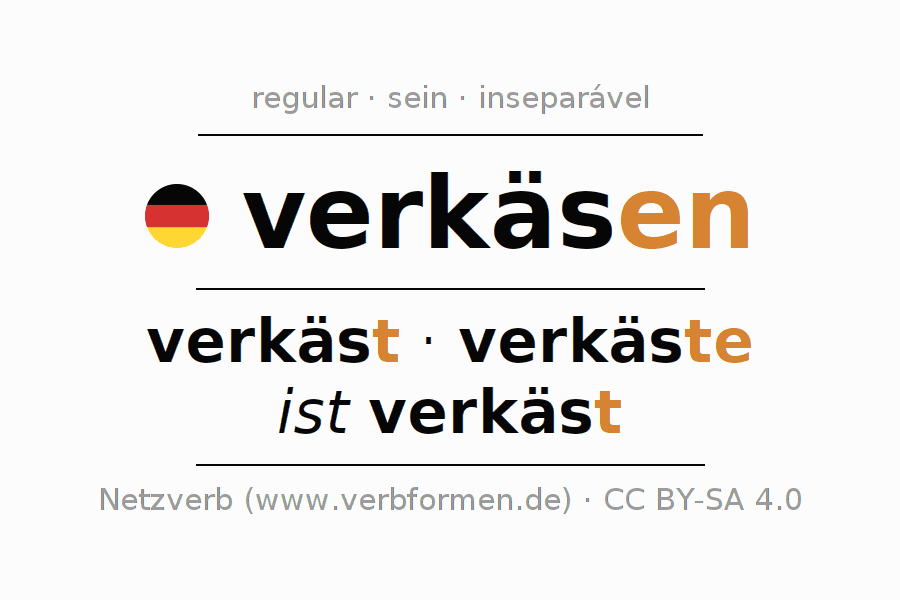 O prefixo ver- de verkäsen é inseparável. A flexão ocorre em Ativo e é usada como Oração principal. Para melhor compreensão estão disponíveis incontáveis. Exemplos do verbo verkäsen . Para a prática e consolidação do estudo
