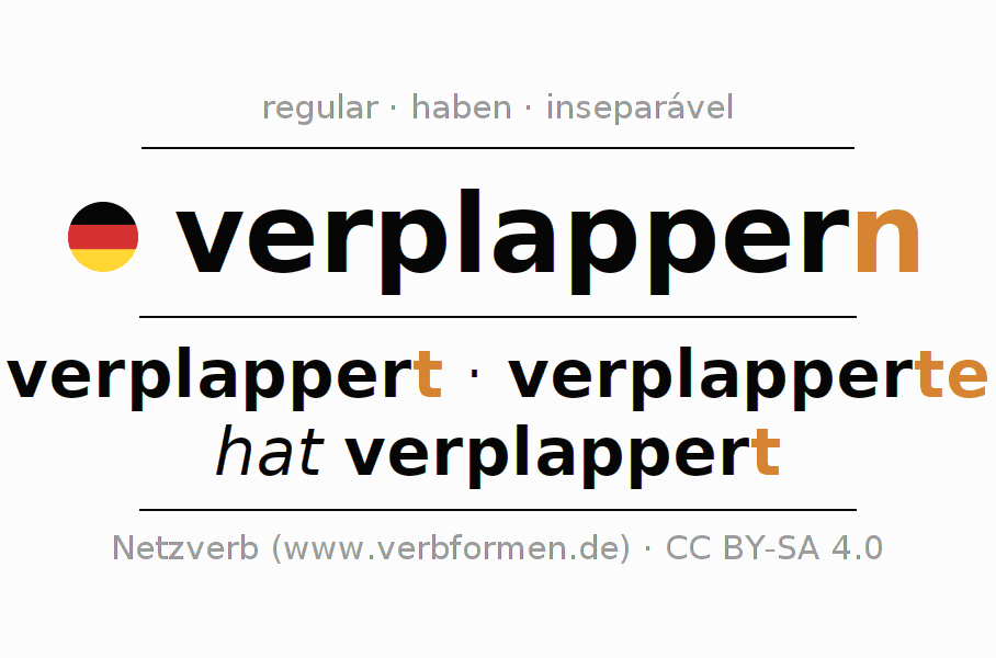A conjugação do verbo verplappern é apresentada online assim como a Tabela de Verbo com todas as formas verbais no singular e no plural, e em todas as pessoas (1ª pessoa, 2ª pessoa, 3ª pessoa) A flexão do verbo verplappern é portanto, uma ajuda para os trabalhos de casa, testes, exames, aulas de alemão, para o estudo do alemão como língua estrangeira, como segunda língua e também na formação de adultos. Especialmente no aprendizado do alemão é importante a conjugação correta do verbo com as respectivamente formas flexionadas corretamente (verplappert - verplapperte - hat verplappert). Mais informações podem ser encontradas no Wiktionary verplappern e no Duden verplappern.
