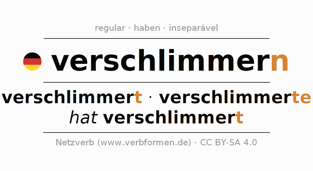 A conjugação do verbo verschlimmern (agravar, piorar) é regular. As formas mais comuns são verschlimmert, verschlimmerte e hat verschlimmert. O verbo auxilar para verschlimmern é "haben".