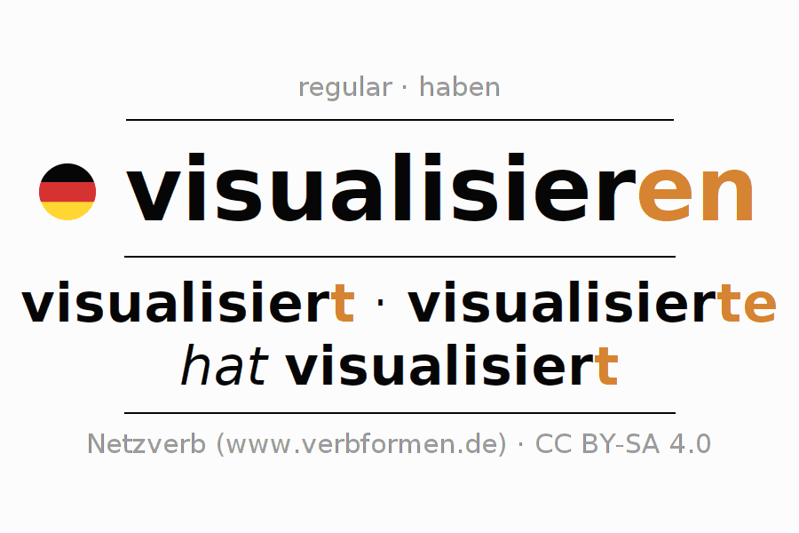 A conjugação do verbo visualisieren (visualizar, representar) é regular. As formas mais comuns são visualisiert, visualisierte e hat visualisiert. O verbo auxilar para visualisieren é "haben".