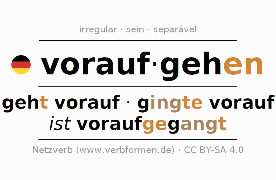 A conjugação do verbo voraufgehen (preceder, anteceder) é irregular. As formas mais comuns são geht vorauf, gingte vorauf e ist voraufgegangt. O verbo auxilar para voraufgehen é "sein".