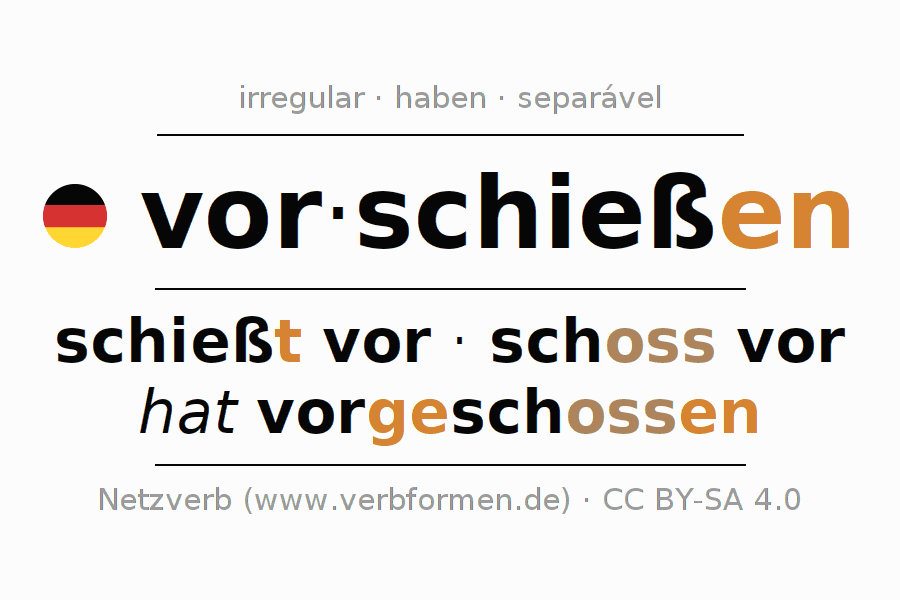 A conjugação do verbo vorschießen (adiantar, antecipar) é irregular. As formas mais comuns são schießt vor, schoss vor e hat vorgeschossen. A apofonia é feita com a vogal do radical ie