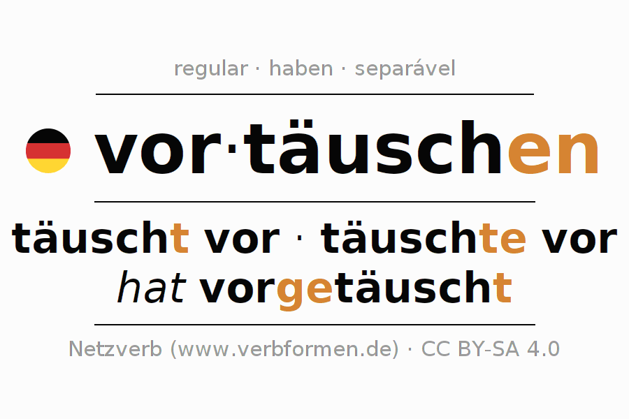 A conjugação do verbo vor·täuschen é apresentada online assim como a Tabela de Verbo com todas as formas verbais no singular e no plural, e em todas as pessoas (1ª pessoa, 2ª pessoa, 3ª pessoa) A flexão do verbo vor·täuschen é portanto, uma ajuda para os trabalhos de casa, testes, exames, aulas de alemão, para o estudo do alemão como língua estrangeira, como segunda língua e também na formação de adultos. Especialmente no aprendizado do alemão é importante a conjugação correta do verbo com as respectivamente formas flexionadas corretamente (täuscht vor - täuschte vor - hat vorgetäuscht). Mais informações podem ser encontradas no Wiktionary vortäuschen e no Duden vortäuschen.
