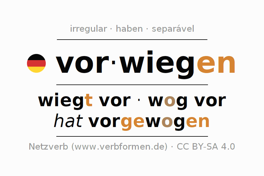 A conjugação do verbo vorwiegen (predominar, prevalecer) é irregular. As formas mais comuns são wiegt vor, wog vor e hat vorgewogen. A apofonia é feita com a vogal do radical ie