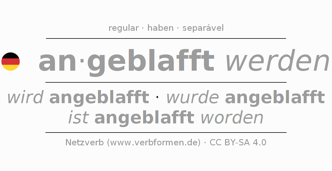 A conjugação do verbo an·geblafft werden é apresentada online assim como a Tabela de Verbo com todas as formas verbais no singular e no plural, e em todas as pessoas (1ª pessoa, 2ª pessoa, 3ª pessoa) A flexão do verbo an·geblafft werden é portanto, uma ajuda para os trabalhos de casa, testes, exames, aulas de alemão, para o estudo do alemão como língua estrangeira, como segunda língua e também na formação de adultos. Especialmente no aprendizado do alemão é importante a conjugação correta do verbo com as respectivamente formas flexionadas corretamente (wird angeblafft - wurde angeblafft - ist angeblafft worden). Mais informações podem ser encontradas no Wiktionary anblaffen e no Duden anblaffen.