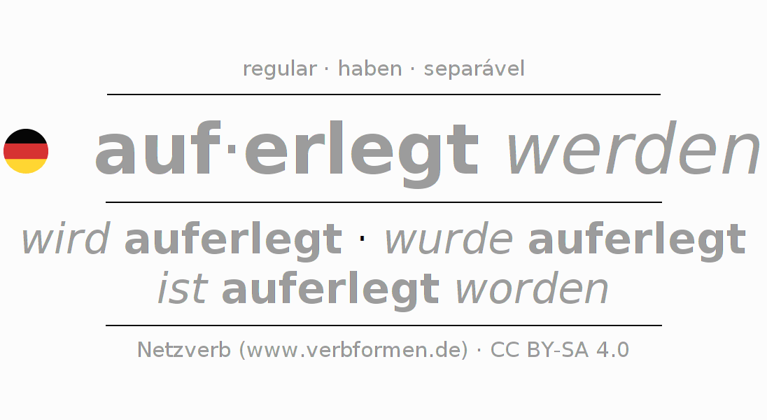 A conjugação do verbo auf·erlegt werden é apresentada online assim como a Tabela de Verbo com todas as formas verbais no singular e no plural, e em todas as pessoas (1ª pessoa, 2ª pessoa, 3ª pessoa) A flexão do verbo auf·erlegt werden é portanto, uma ajuda para os trabalhos de casa, testes, exames, aulas de alemão, para o estudo do alemão como língua estrangeira, como segunda língua e também na formação de adultos. Especialmente no aprendizado do alemão é importante a conjugação correta do verbo com as respectivamente formas flexionadas corretamente (wird auferlegt - wurde auferlegt - ist auferlegt worden). Mais informações podem ser encontradas no Wiktionary auferlegen e no Duden auferlegen.