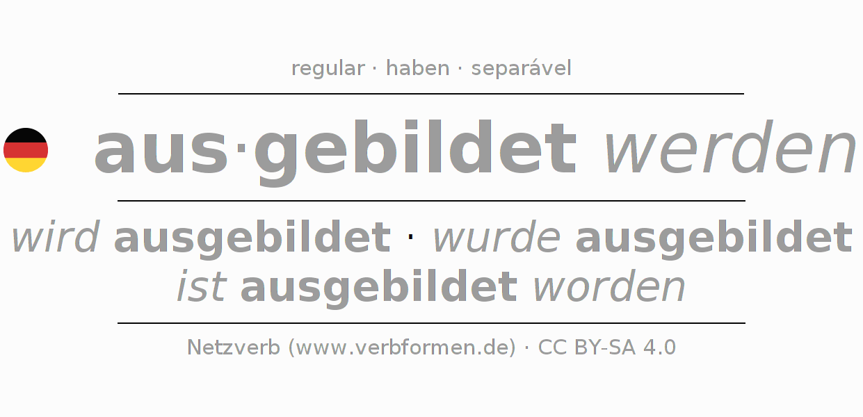 A conjugação do verbo aus·gebildet werden é apresentada online assim como a Tabela de Verbo com todas as formas verbais no singular e no plural, e em todas as pessoas (1ª pessoa, 2ª pessoa, 3ª pessoa) A flexão do verbo aus·gebildet werden é portanto, uma ajuda para os trabalhos de casa, testes, exames, aulas de alemão, para o estudo do alemão como língua estrangeira, como segunda língua e também na formação de adultos. Especialmente no aprendizado do alemão é importante a conjugação correta do verbo com as respectivamente formas flexionadas corretamente (wird ausgebildet - wurde ausgebildet - ist ausgebildet worden). Mais informações podem ser encontradas no Wiktionary ausbilden e no Duden ausbilden.