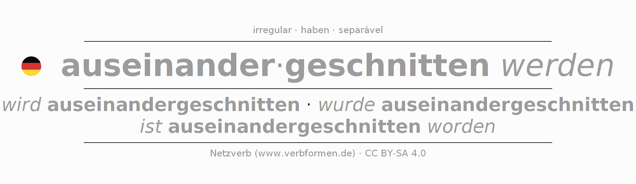 A conjugação do verbo auseinanderschneiden (cortar em partes) é irregular. As formas mais comuns são wird auseinandergeschnitten, wurde auseinandergeschnitten e ist auseinandergeschnitten worden. A apofonia é feita com a vogal do radical ei