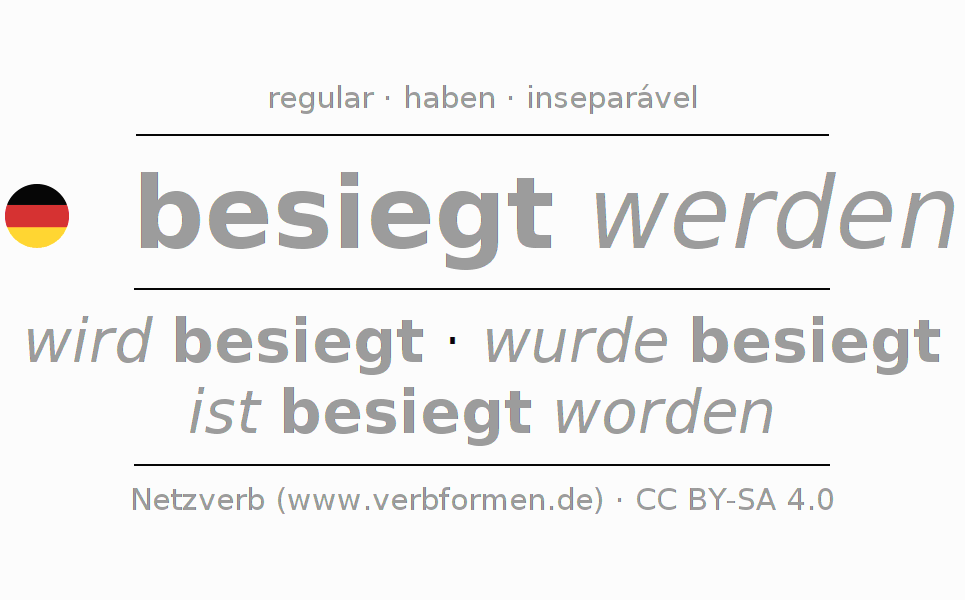 A conjugação do verbo besiegen (vencer, derrotar) é regular. As formas mais comuns são wird besiegt, wurde besiegt e ist besiegt worden. O verbo auxilar para besiegen é "haben".