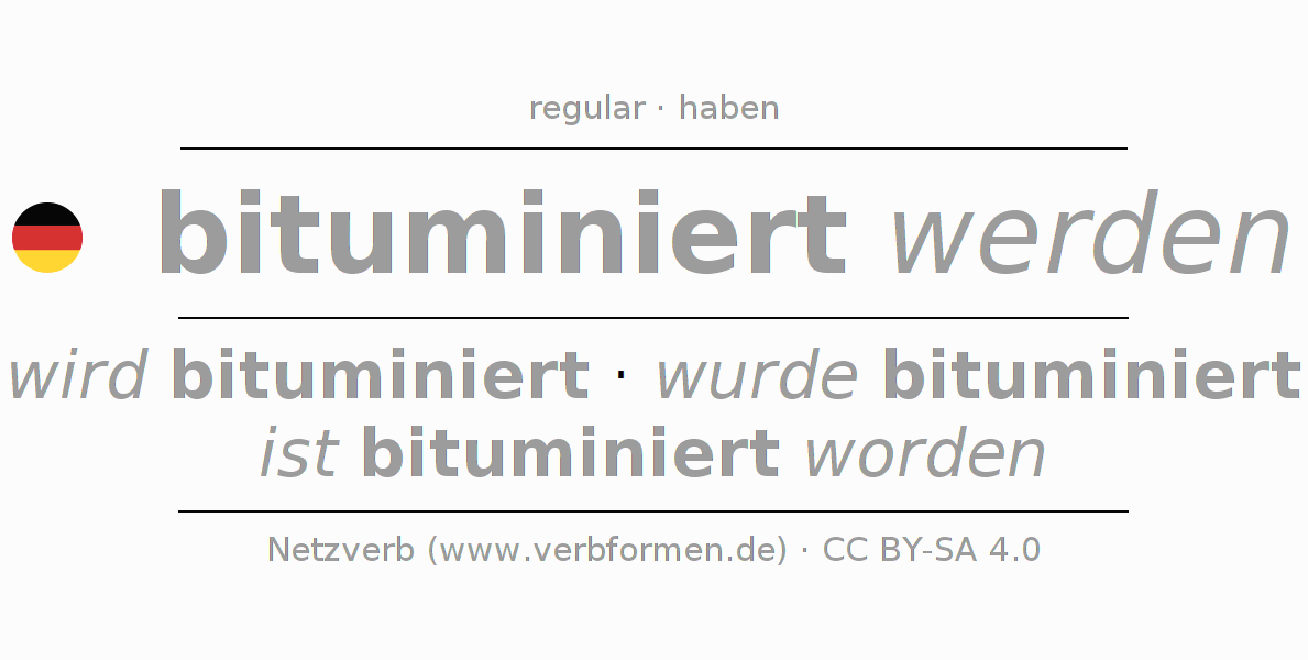 A conjugação do verbo bituminieren (betumar) é regular. As formas mais comuns são wird bituminiert, wurde bituminiert e ist bituminiert worden. O verbo auxilar para bituminieren é "haben".