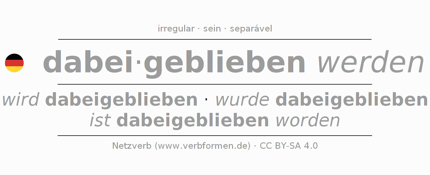 A conjugação do verbo dabeibleiben (continuar, permanecer) é irregular. As formas mais comuns são wird dabeigeblieben, wurde dabeigeblieben e ist dabeigeblieben worden. A apofonia é feita com a vogal do radical ei