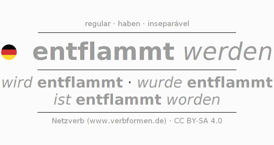 A conjugação do verbo entflammen (acender, inflamar) é regular. As formas mais comuns são wird entflammt, wurde entflammt e ist entflammt worden. O verbo auxilar para entflammen é "haben". No entanto, há formas verbais com o verbo auxiliar " sein".