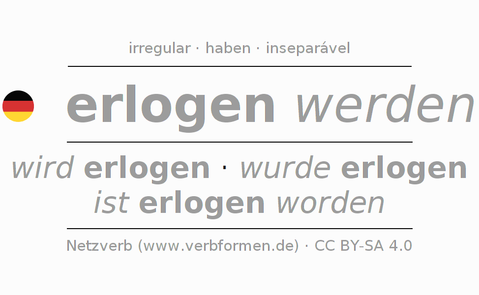 A conjugação do verbo erlogen werden é apresentada online assim como a Tabela de Verbo com todas as formas verbais no singular e no plural, e em todas as pessoas (1ª pessoa, 2ª pessoa, 3ª pessoa) A flexão do verbo erlogen werden é portanto, uma ajuda para os trabalhos de casa, testes, exames, aulas de alemão, para o estudo do alemão como língua estrangeira, como segunda língua e também na formação de adultos. Especialmente no aprendizado do alemão é importante a conjugação correta do verbo com as respectivamente formas flexionadas corretamente (wird erlogen - wurde erlogen - ist erlogen worden). Mais informações podem ser encontradas no Wiktionary erlügen e no Duden erlügen.
