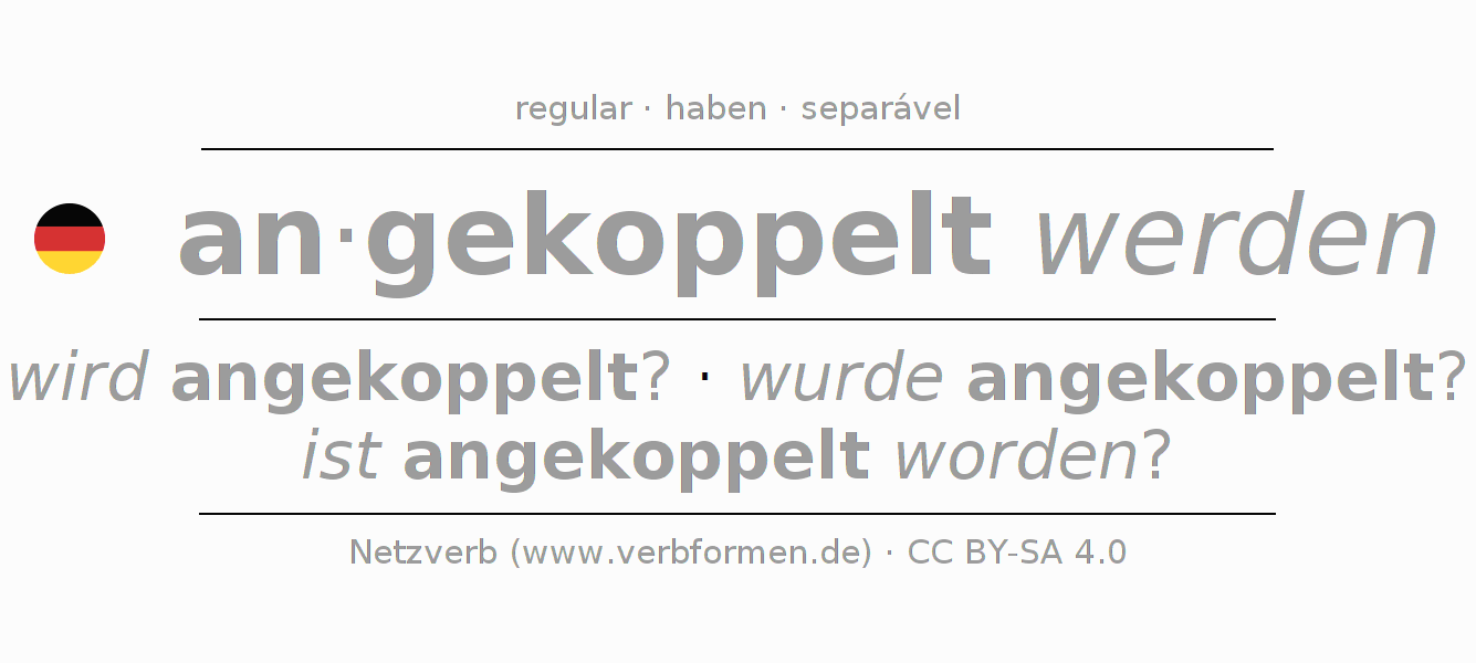A conjugação do verbo ankoppeln (acoplar, conectar) é regular. As formas mais comuns são wird angekoppelt?, wurde angekoppelt? e ist angekoppelt worden?. O verbo auxilar para ankoppeln é "haben".