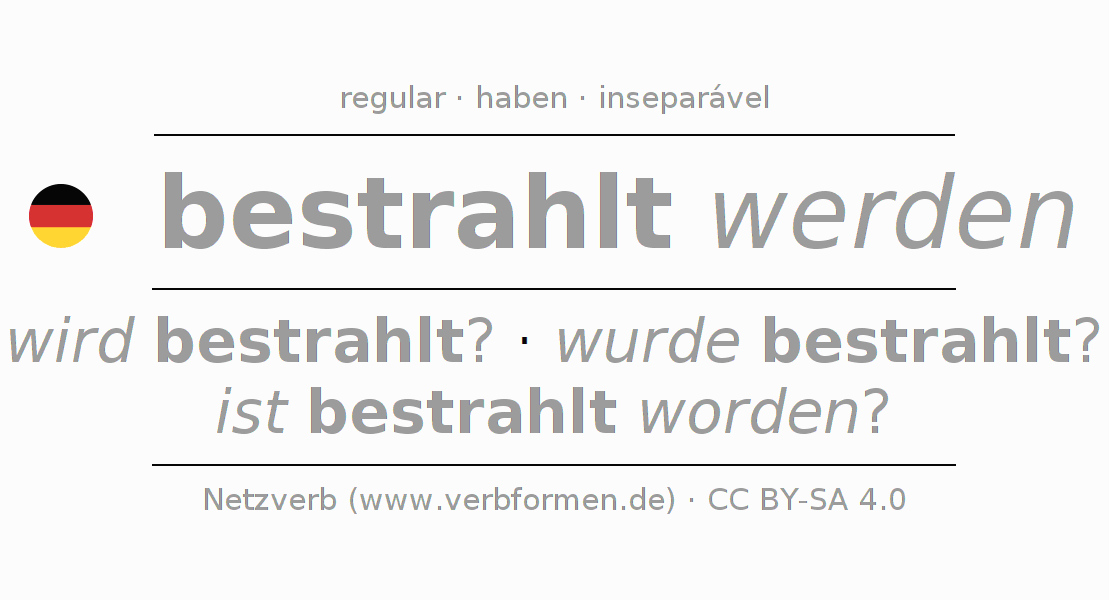 A conjugação do verbo bestrahlen (irradiar, expor a radiação) é regular. As formas mais comuns são wird bestrahlt?, wurde bestrahlt? e ist bestrahlt worden?. O verbo auxilar para bestrahlen é "haben".
