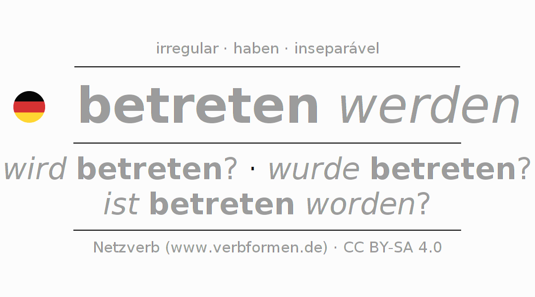 A conjugação do verbo betreten (entrar, pisar) é irregular. As formas mais comuns são wird betreten?, wurde betreten? e ist betreten worden?. A apofonia é feita com a vogal do radical e